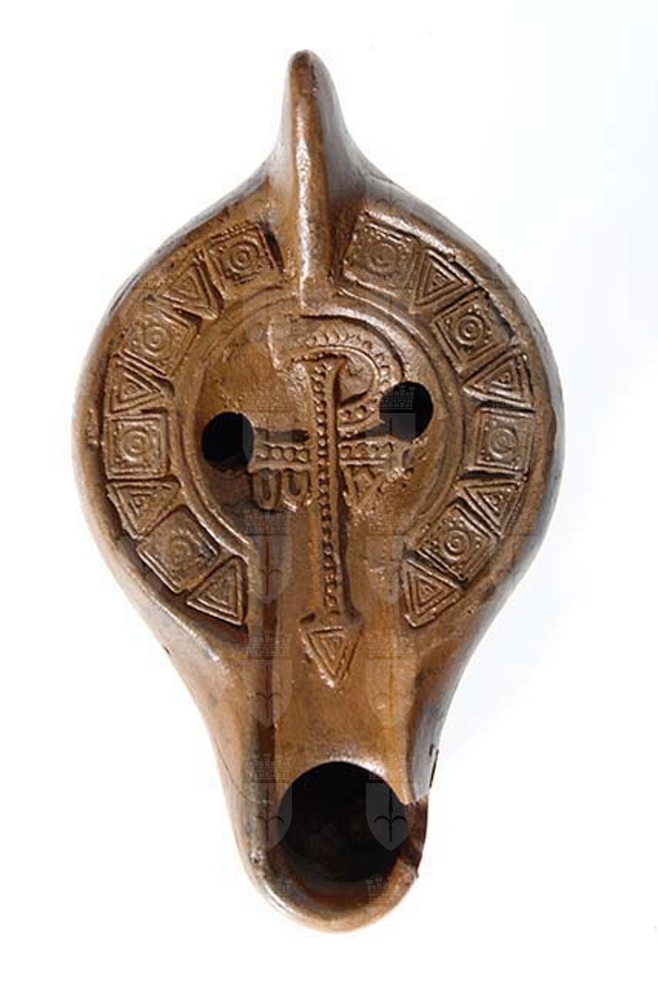 Lucerna africana. Ansa piena, puntuta. Nel disco concavo, a due «infundibula» leggermente obliqui, croce monogrammatica gemmata, con i bracci appena espansi; occhiello della «rho» aperto e asta verticale, che poggia su un triangolo gemmato; sotto l'asta orizzontale pendono le lettere apocalittiche Sulla spalla decorazione geometrica: quadri alternati a triangoli gemmati. Sottofondo piatto con piedino circolare in rilievo al cui centro sono incise due circonferenze concentriche.