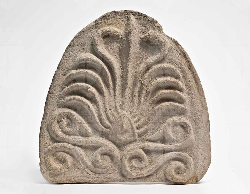 Argilla di color beige chiaro, in frattura argilla beige. Alla base vi sono due elementi terminanti alle estremità in volute, da cui spuntano altri due elementi, che si sviluppano orizzontalmente e terminano in volute, e un triangolo; da questo spuntano undici petali sottili e incavati: il centrale è dritto fino al bordo superiore, i due laterali a questo si curvano verso l'interno, i restanti verso l'esterno.
