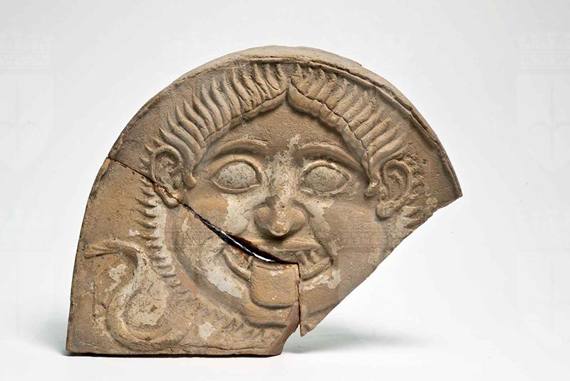 Argilla di color beige chiaro, in frattura color sabbia. Superficie rovinata dalle incrostazioni. Antefissa semiellittica, mancante della parte in basso a destra, con frattura che corre dal bordo sinistro all'altezza dell'orecchio verso la bocca, tagliandola, e scende verticalmente sul lato destro della lingua. E' presente un serpente a sinistra che esce dalla barba.
