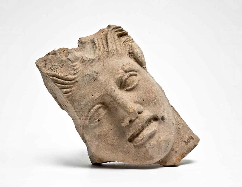 Argilla di color grigio chiaro, in frattura rosata. La forma degli occhi è simile a inv. 3816 (T.6), ma la lieve diversità nella resa della bocca, più larga e meno carnosa, impedisce di ipotizzare un'identità di matrice.