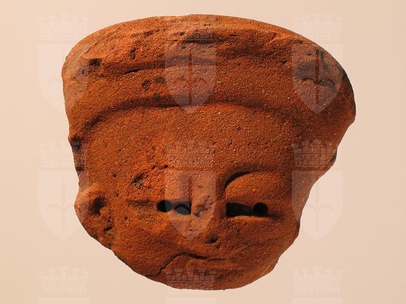 Testa umana di stile Usulután in terracotta rossa, modellata in maniera piuttosto sommaria. L’interno è pieno. Le orecchie, il naso, le labbra e le palpebre sono parzialmente sbocconcellati. Anche la patina esterna appare ruvida e discontinua. Gli occhi sono costituiti dalla consueta fessura orizzontale, al centro della quale è stato praticato un foro. La fronte alta e appiattita si sviluppa in alto con una forma trapezoidale: questa termina in una sorta di turbante, le cui fasce in rilievo avvolgono strettamente la testa.