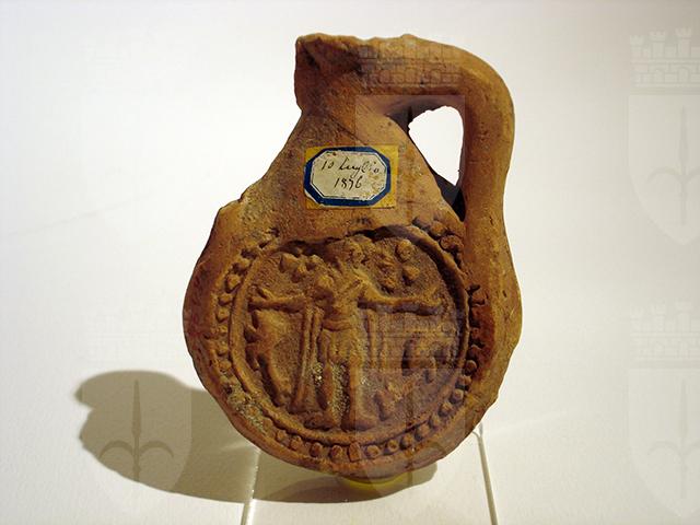 Ampolla piatta in argilla nocciola rosata, depurata, priva di un’ansa, con scheggiature sul bordo del collo e sull’ansa superstite. Incrostazioni sulla superficie. Sulle due facce dell’ampolla, entro un medaglione piatto delimitato da un bordo perlinato che circoscrive un anello a rilievo, vi è la medesima scena: San Menas, con l’abito militare, in atteggiamento di preghiera. La testa è inquadrata da una croce greca sulla destra e da una croce a forma di fiore quadripetalo sulla sinistra. Ai piedi del santo, i due cammelli sono di dimensioni diverse (quello sinistro è più piccolo e senza coda).