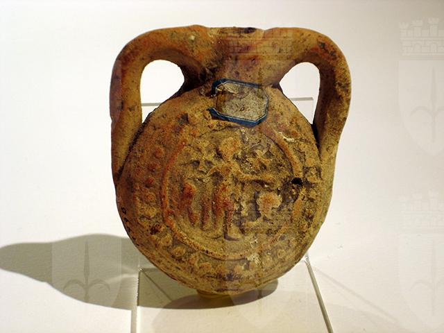 Ampolla piatta in argilla rosata, ottenuta da matrice alquanto consunta. Sulle due facce del disco piano, una cornice a globetti entro un doppio anello rilevato racchiude lo stesso motivo decorativo: San Menas in piedi al centro, in veste militare e in posizione di orante, si trova tra i due cammelli. Le due croci ai lati della testa del santo sono di forme diverse: sul lato A quella di sinistra ha i bracci a coda di rondine, mentre quella a destra è apicata; sul lato B la posizione è all’inverso.
