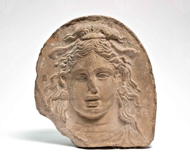 Argilla di color beige, in frattura argilla rosata. Tracce di colore bianco su capelli, orecchie e sfondo. Proviene dalla stessa matrice dell'antefissa inv. 3837 (T.1405). Il collo è solcato da due rughe orizzontali ed è presente un accenno delle spalle, coperte da una leggera veste che presenta alcune pieghe.
