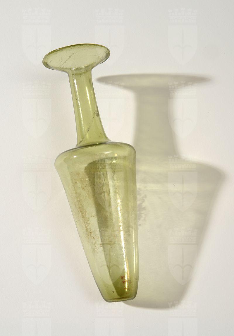 Realizzata in vetro sottile verdastro, trasparente, presenta poche bolle piccole. Orlo estroflesso, labbro ingrossato e arrotondato, collo cilindrico, spalla marcata e arrotondata, ventre troncoconico, fondo leggermente concavo.