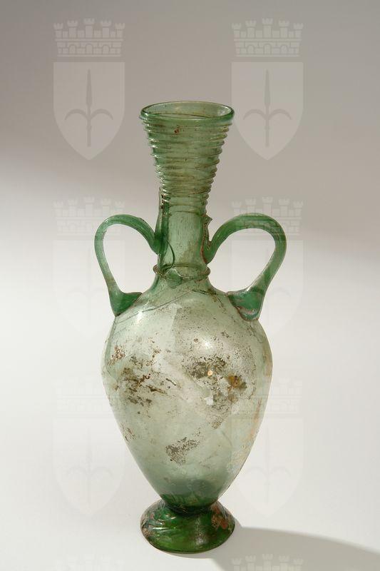 Realizzata in vetro mediamente spesso, di colore verde/azzurro, trasparente;presenta molte bolle sia piccole che grandi. Orlo leggermente estroflesso, labbro arrotondato; collo cilindrico; anse a bastoncello ad orecchia tra collo e spalla; ventre ovoidale; fondo su piede ad anello a sezione troncoconica lavorato a parte. Un filamento a spirale di vetro dello stesso colore è avvolto sotto l'orlo, un altro filamento forma un collarino alla base del collo.