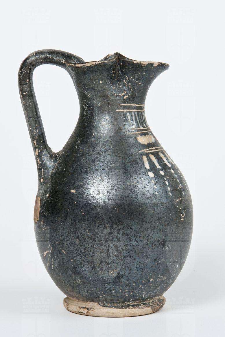 Oinochoe a vernice nera, tendente al grigio, con sovraddipinture in bianco, giallo, rosso amaranto ed incisioni. Orlo trilobato, collo a profilo concavo, corpo ovoidale, ansa a nastro obliqua, desinente alla sommità, nel punto d’attacco all’orlo, in una protuberanza, stilizzazione di una protome, basso piede ad anello. Lungo il collo: tra tre coppie di linee incise, ovuli dipinti in bianco e tremuli giallo-rossi; pendenti lunghi campiti in giallo su base bianca.