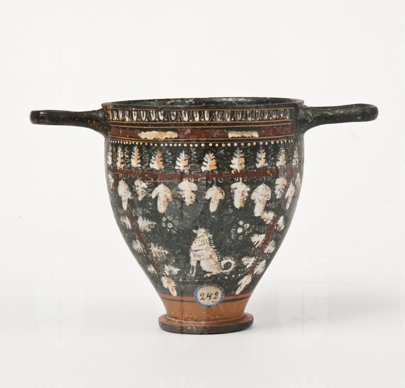 Skyphos ad anse orizzontali a vernice nera sovraddipinta. Decorazione a fasce di ovuletti, bande rosse e gialle, palmette e viticci, anche verticali sul ventre. Al centro del lato principale un cane e due rose