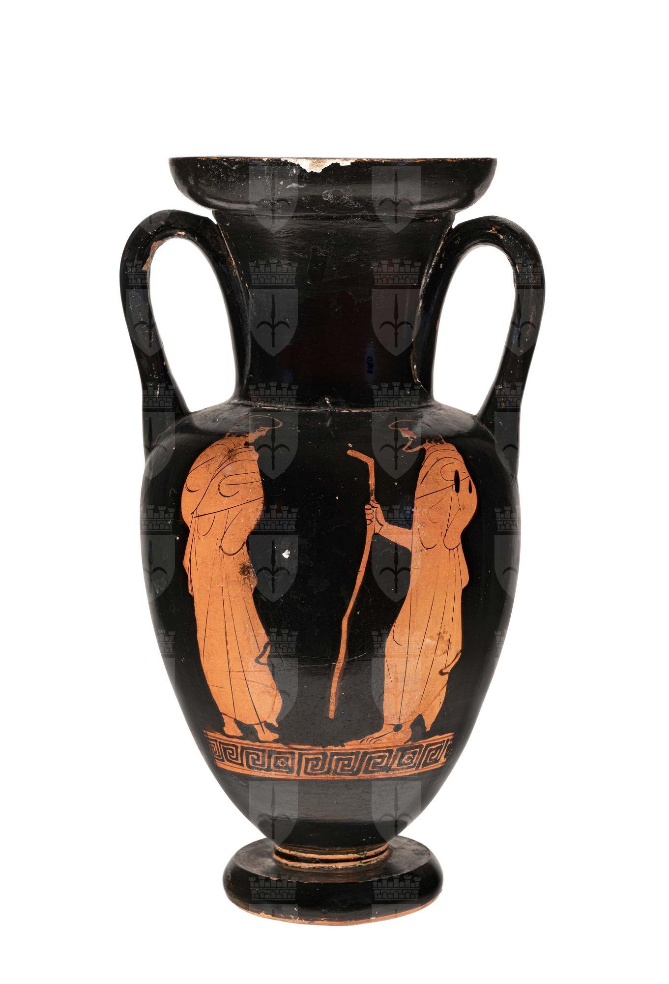 Anfora nolana attica a figure rosse. Lato A: uomo con bastone e ragazzo, entrambi ammantati. Lato B: giovane stante ammantato.