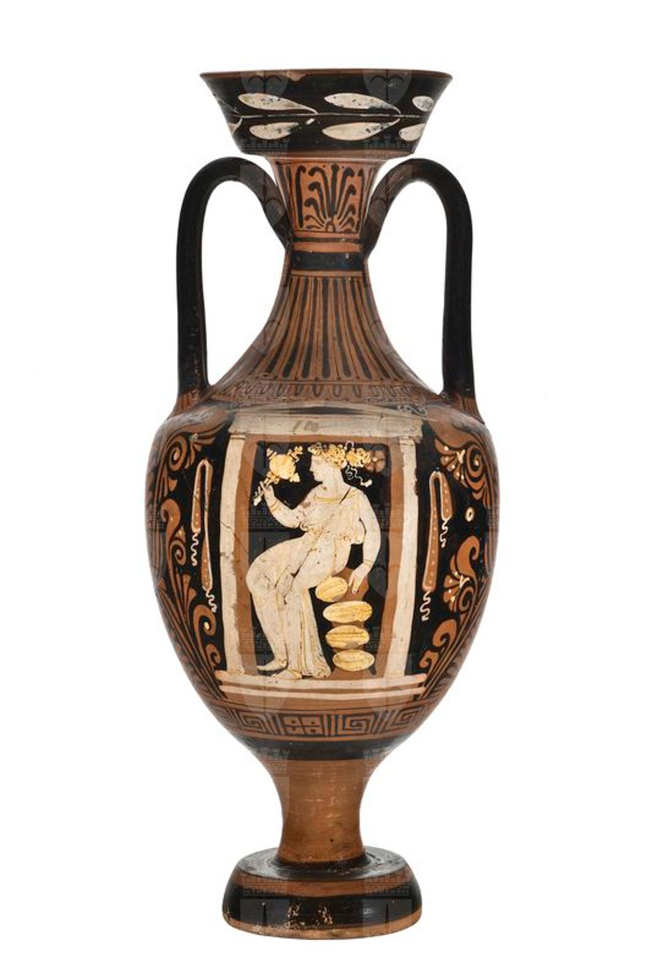 Anfora panatenaica a figure rosse con elementi sovradipinti in bianco e giallo. Alto labbro svasato; collo stretto; breve spalla arrotondata; corpo ovale; alto stelo su ampio piede troncoconico; anse a nastro impostate fra il centro del collo e la spalla. Sul labbro ramo d'alloro; palmette sovrapposte fra girali con foglie; inferiormente meandro interrotto da rettangoli con croce e puntini. Lato A: defunta in chitone seduta su roccia all'interno di un'edicola con specchio in mano. Lato B: scena di offerta: donna stante con phiale e serto a corona.