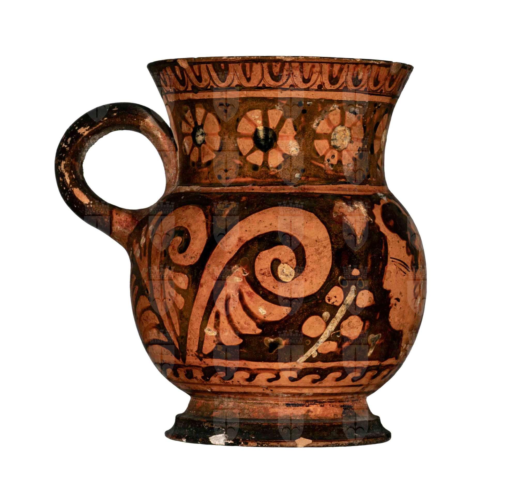 Boccale apulo a figure rosse con piccolo manico anulare verticale. Sul ventre testa femminile, foglie d'edera, fiore campanuliforme; fila di rosette sul collo e motivo ad onde sopra il piede.