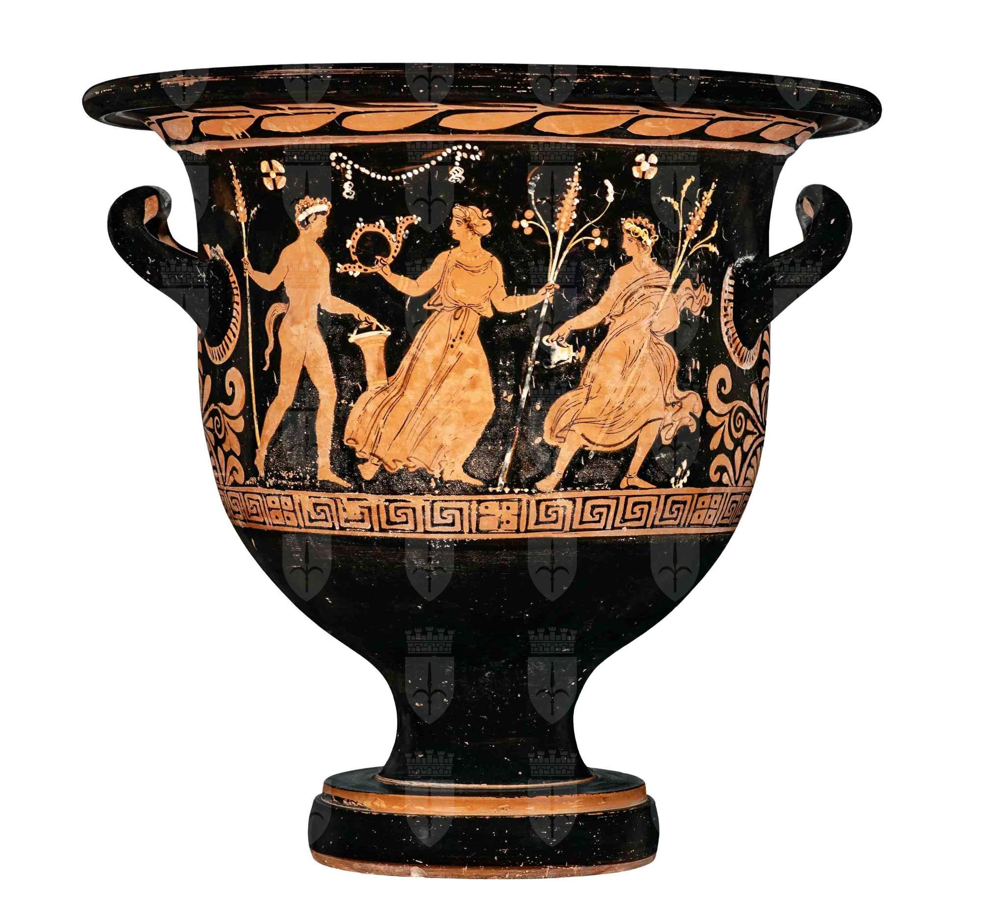 Cratere a campana a figure rosse. Lato A: corteo dionisiaco: satiro nudo con situla e tirso, menade con tirso e serto, Dioniso con kantharos e tirso; Lato B: tre giovani ammantat.