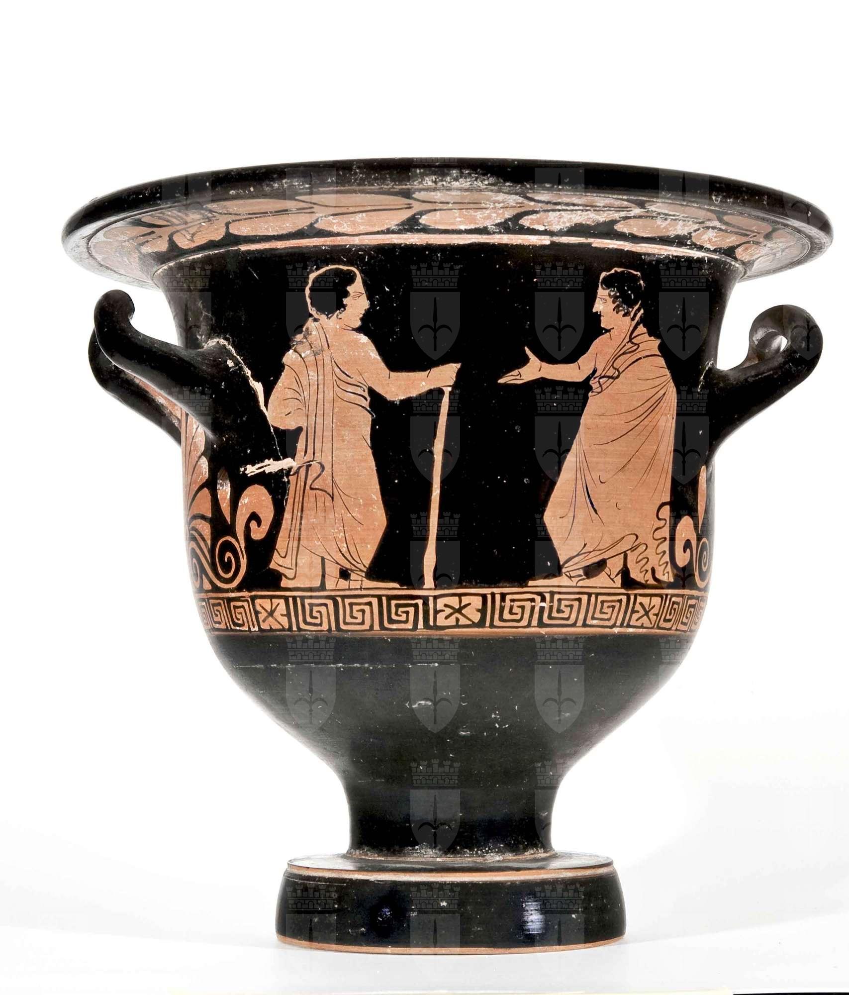 Cratere a campana a figure rosse. Lato A: satiro in marcia con fiaccola e situla, Dioniso nudo con patera e tirso. Lato B: due figure maschili ammantate, una con bastone, l'altra con atteggiamento colloquiante.
