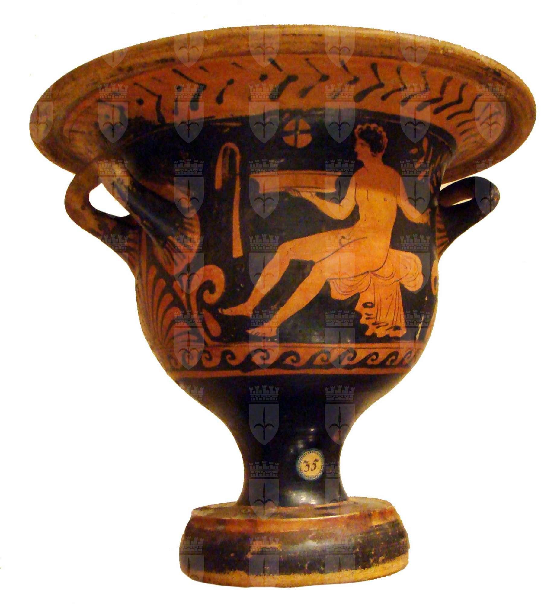 Cratere a campana apulo a figure rosse. Lato A: giovane nudo seduto con patera e tirso. Lato B: figura femminile seduta con flabellum e cofanetto.