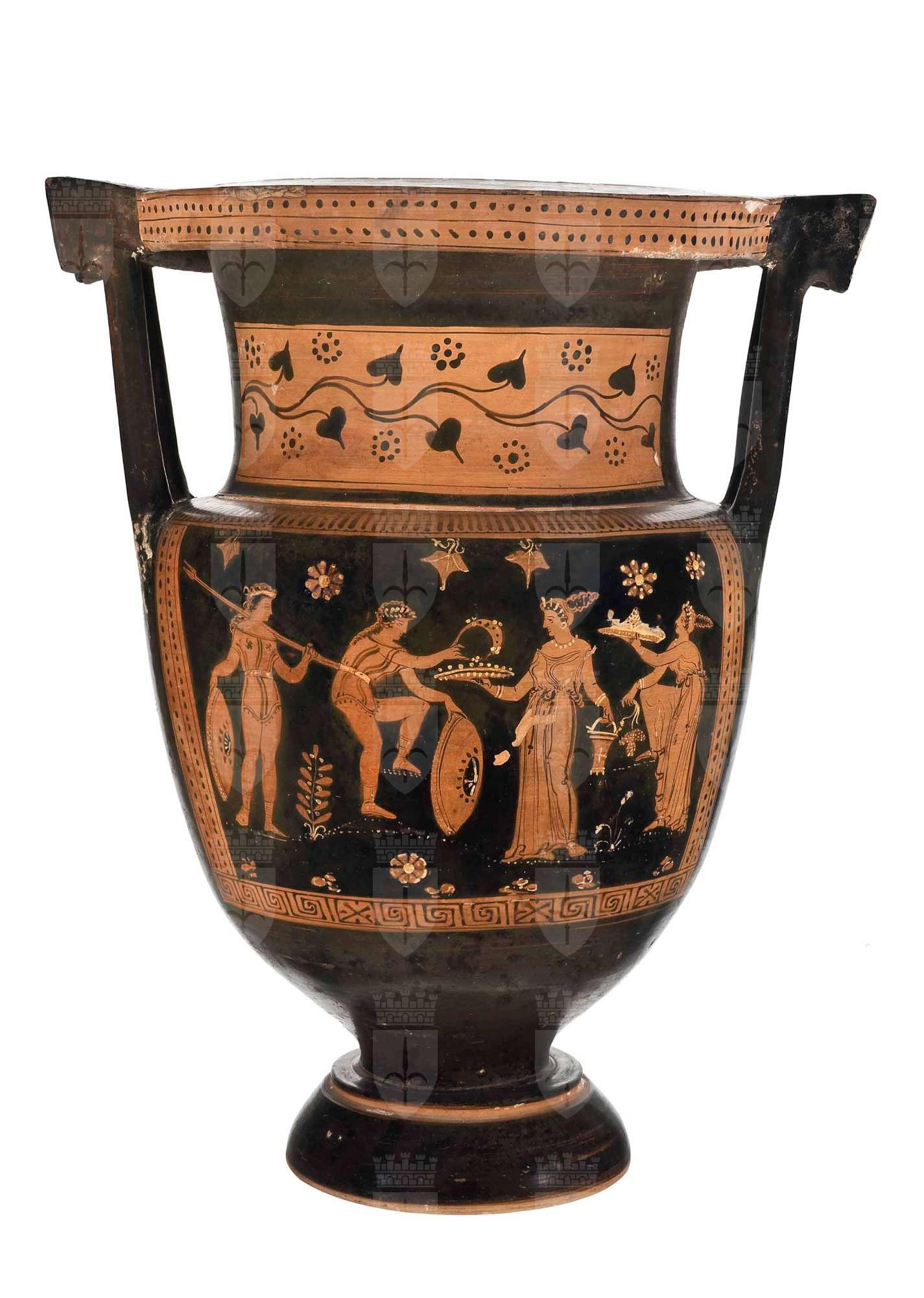 Cratere a colonnette apulo a figure rosse; fasce di meandri, puntini e serto d'edera sul collo. Lato A: scena di offerta: guerriero con scudo e lancia, guerriero piegato in avanti con scudo e serto; donna con patera, offerte e situla; donna con grappolo d'uva e patera. Lato B: tre giovani ammantati, due halteres e palla.