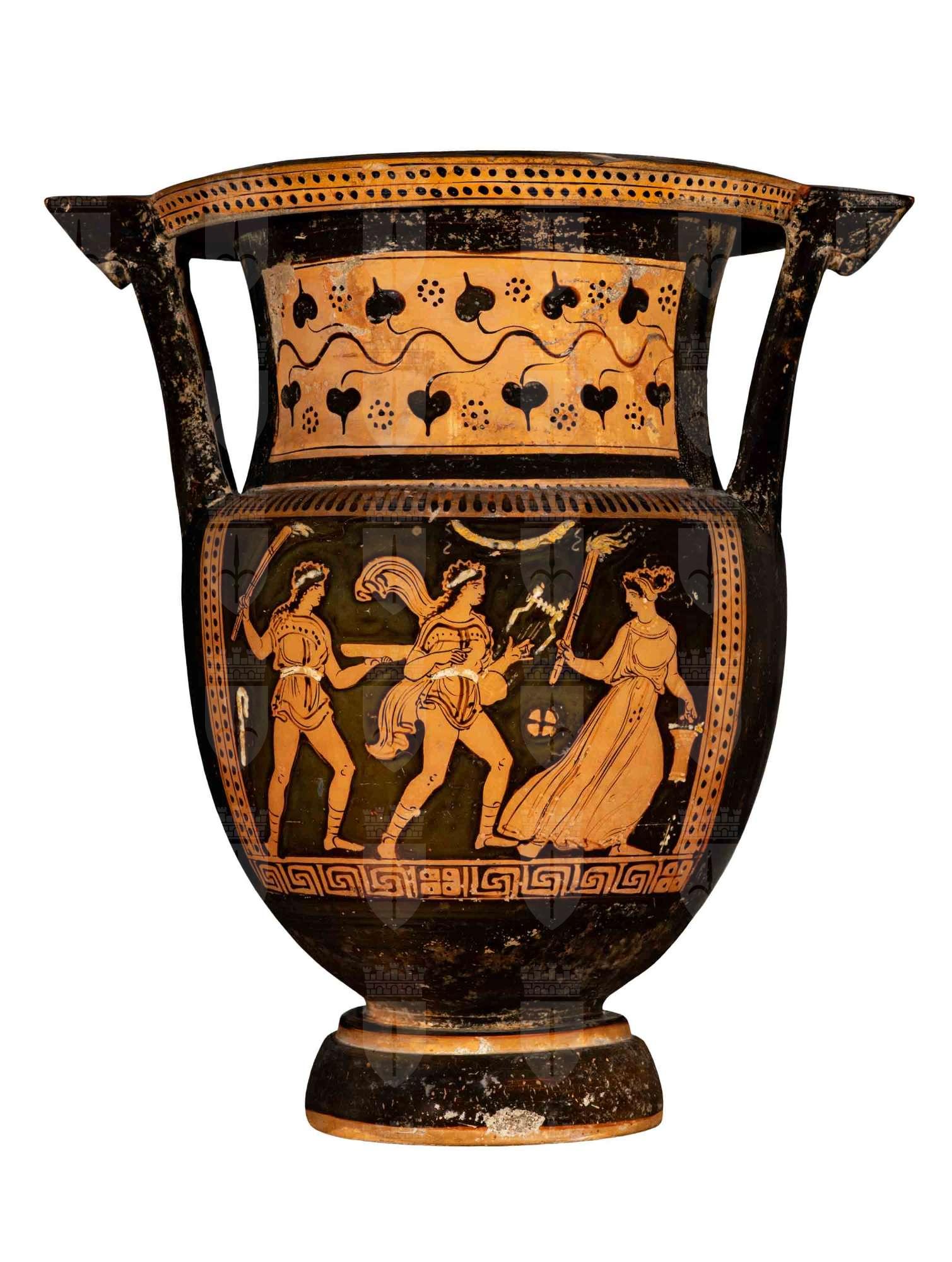 Cratere a colonnette apulo a figure rosse. Lato A: donna in corsa con fiaccola e situla, due giovani rispettivamente con lira e plettro, patera e fiaccola. Lato B: tre giovani ammantati, phiale e palla.