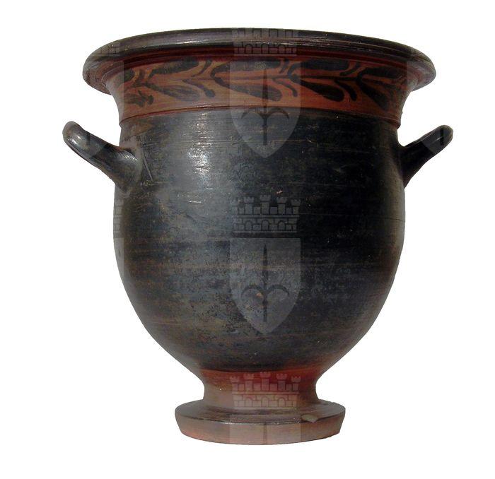 cratere a campana nero a corpo allungato; decorazione con ramo d'ulivo sotto l'orlo nero su fascia rossa