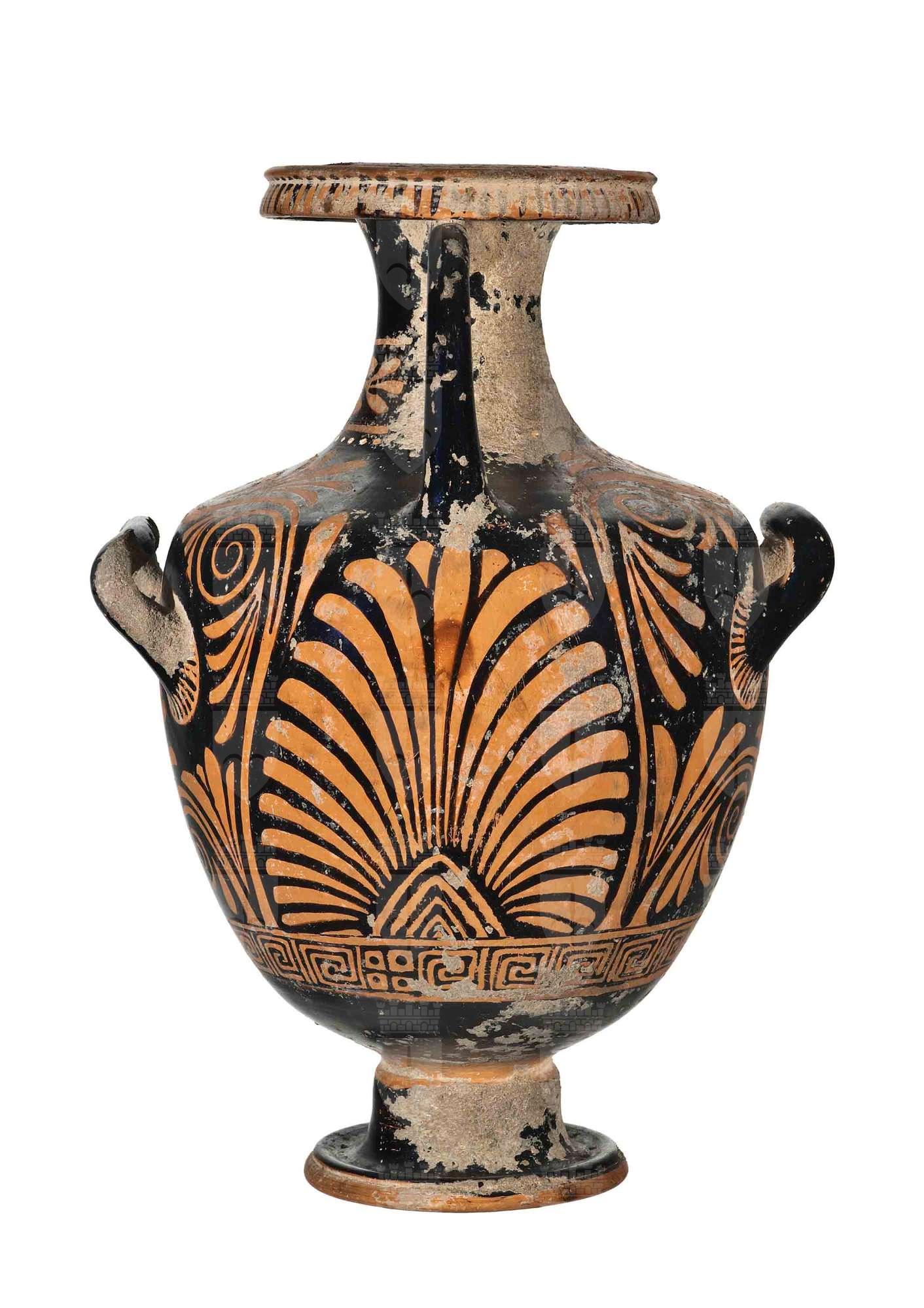 Hydria apula a figure rosse con giovane nudo seduto con patera con offerte e serto d'alloro; donna stante poggiata a pilastro con serto d'alloro e vestita di chitone; benda sospesa sulla spalla, sotto l'ansa grande palmetta.