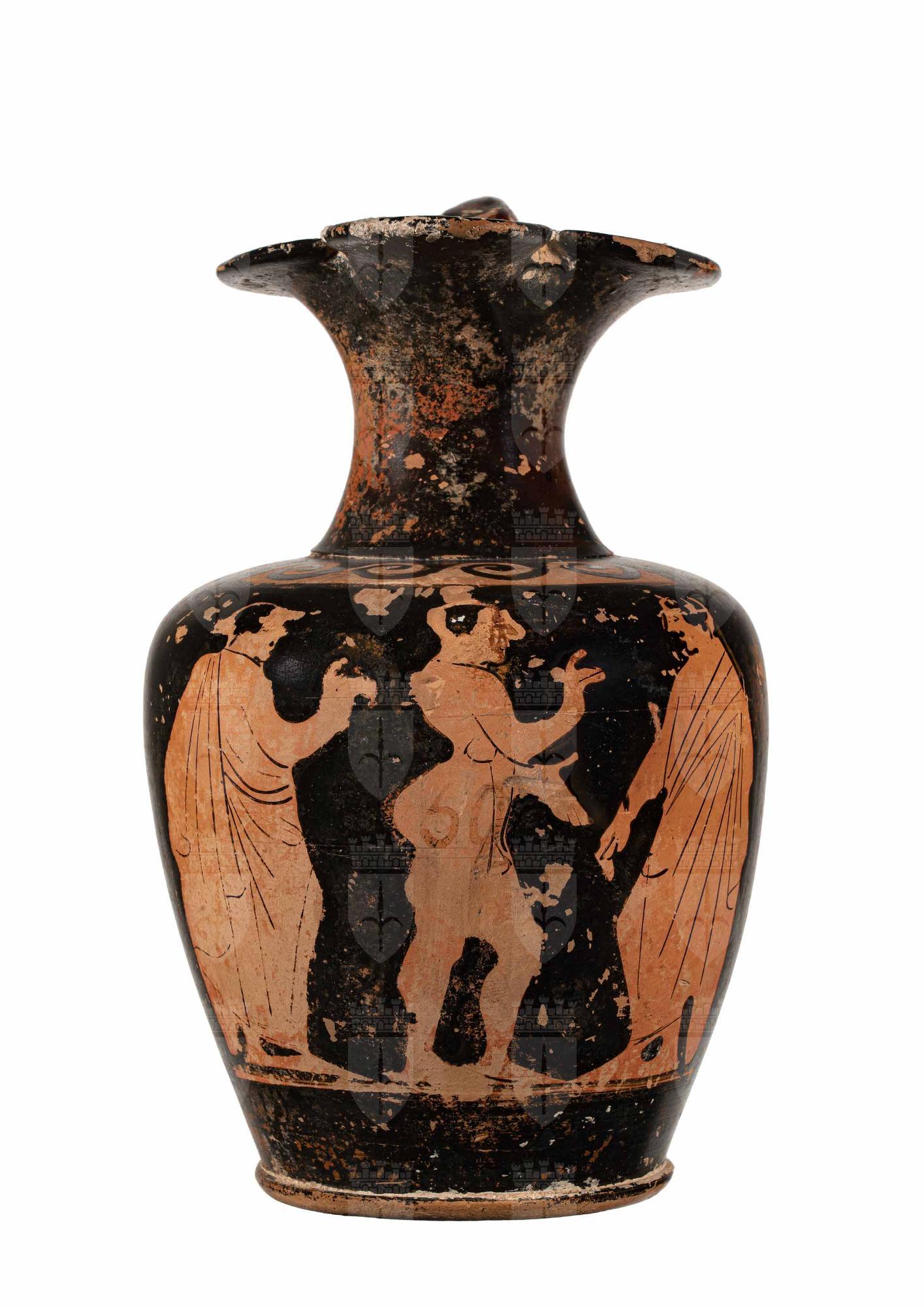 Bocca trilobata con labbro arrotondato; Sulle spalle, in coincidenza della scena figurata, serie di quattro onde correnti verso destra lasciate a risparmio. Lato A: tre giovani a colloquio Sulla siniatra giovane ammantato, stante,è rivolto di profilo verso destra con l’avambraccio d. sollevato, nell’atto di parlare; indossa un himation lungo fino alle caviglie che lascia scoperti i piedi scalzi. Replica la stessa posa, ma con ponderazione delle gambe opposta, anche il personaggio al centro, ritratto, differentemente dai compagni, in completa nudità. Sulla destra giovane ammantato, stante, è ritratto di profilo verso sinistra con il braccio, lasciato scoperto dall’himation, pronto a sollevarsi; i piedi, scalzi, rimangono visibili al di sotto del mantello. Le condizioni di abrasione della superficie pittorica non consentono ulteriori dettagli sui visi dei personaggi, eccetto la capigliatura a calotta e i tratti del personaggio sulla destra: il naso aquilino, occhio reso da un unico tratto diritto, tendente verso l’alto e mento prominente. Al di sotto dei personaggi, linea di terra a risparmio.