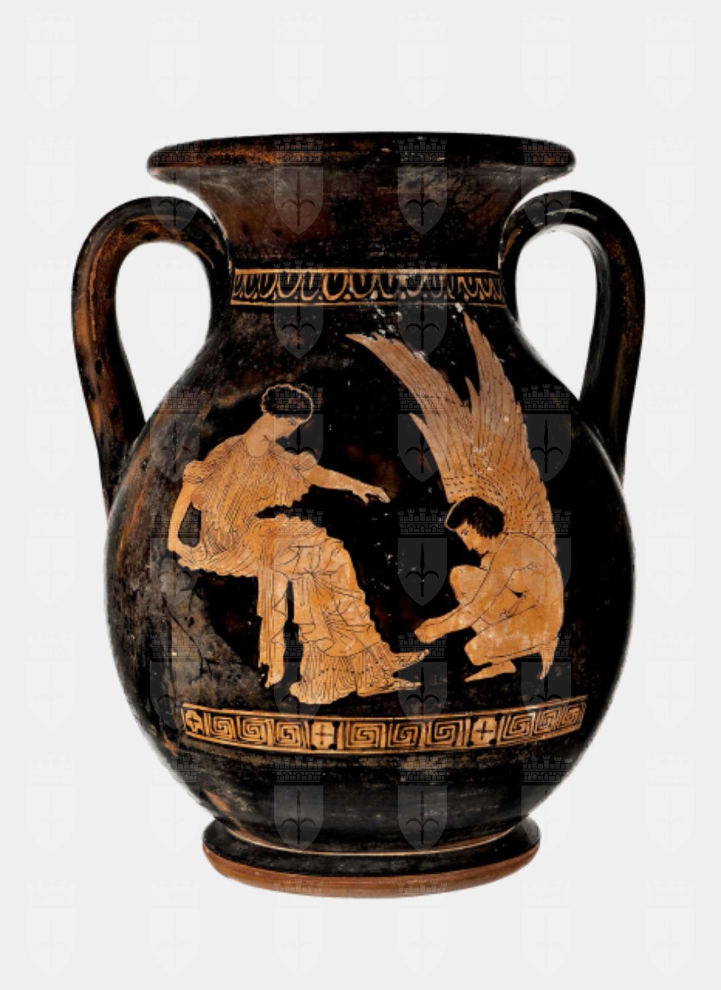 Pelike a figure rosse. Lato A: Eros allaccia il sandalo ad una fanciulla in lungo chitone seduta. Lato B: Un giovane ammantato con lungo bastone nella destra.
