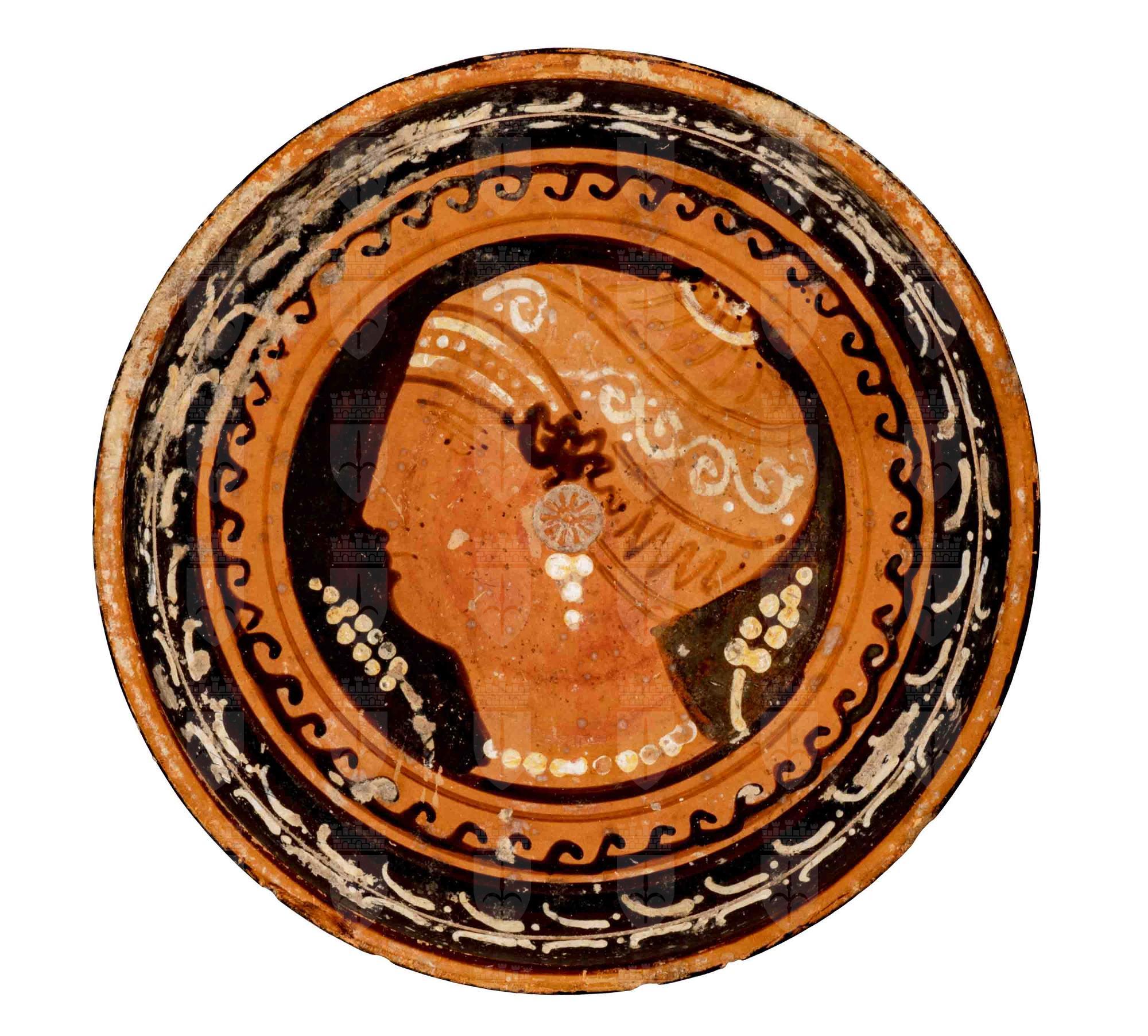 Piatto apulo a figure rosse. Interno: testa femminile con mitella tra due grappoli.