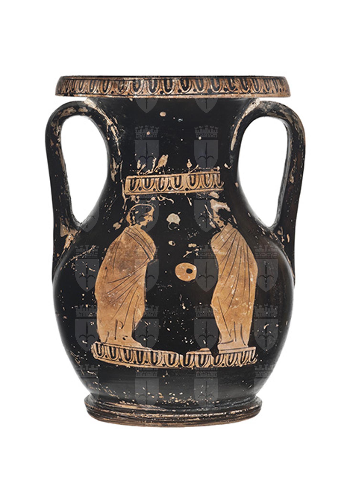 Argilla giallo rossastra (5YR 6/6 Munsell); vernice lucente, di buona qualità, ben conservata ma scalfita e diluita in alcuni punti. Le scalfitture sono presenti su tutte le zone del vaso in maniera omogenea; in particolar modo presso la zona dell'orlo, del collo, delle anse e del piede. Il vaso presenta un corpo piriforme con breve collo a profilo concavo, labbro estroflesso e largo piede a disco. La coppia di anse verticali a nastro è impostata tra spalla e collo. Decorazione del lato A: al centro della scena è raffigurato di prospetto un erote alato seduto. Il piumaggio delle ali è stato reso in modo stilizzato per mezzo di puntini e una fitta fila di trattini verticali nella parte superiore, mentre parte inferiore delle ali è resa con una decorazione a nette linee incise, interrotte soltanto per dare spazio alla mano della donna sulla sinistra. Il supporto su cui è accovacciato l'erote, invece, è costituito da una roccia, il cui materiale è reso da un motivo di tre puntini alternati a doppi trattini verticali. La figura femminile, raffigurata di profilo e vestita con uno stretto chitone drappeggiato, è ritratta nell'atto di reggere forse uno strumento. A destra dell'erote, invece, è raffigurato un satiro barbato danzante, con coda e orecchie equine, che regge un otre con il braccio e la mano sinistra. Decorazione del lato B: sono raffigurati due giovani ammantati, stanti e di profilo, a colloquio. I due sono ritratti uno di fronte all'altro, entrambi rivolti verso il centro della scena. Il giovane a destra porta il peso sulla sola gamba destra, mentre l'altra, il cui polpaccio è lasciato appena scoperto dalla veste, è piegata, a riposo. Tra i due, proprio al centro della scena, è raffigurato un oggetto di forma circolare, forato al centro, identificabile come un altere (peso usato nelle gare di salto in lungo). La decorazione accessoria è costituita da un meandro costituito dalla sequenza ovulo-guscio-puntino, che si ritrova non solo sul labbro, ma anche sopra e sotto le scene figurate. Due sottili filetti graffiti decorano rispettivamente il punto di stacco tra ventre e piede e il bordo superiore dello spessore del piede.