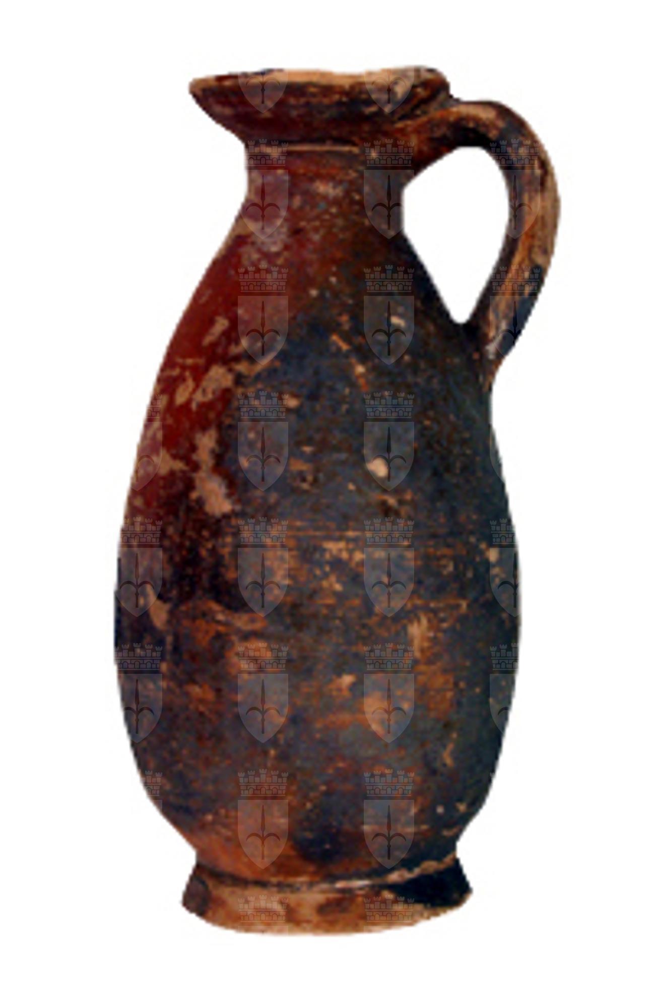 Olpe miniaturistica con corpo allungato e leggermente espanso con base piana e ansa verticale; vernice nera parzialmente abrasa, decorazione a filetti paralleli concentrici.