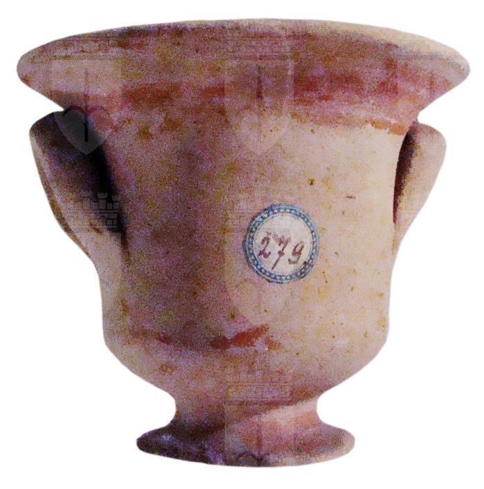 Cratere a campana miniaturistico. Orlo svasato, anse verticali impostate sul ventre, piede ad anello con basso stelo. Decorazione in vernice rosso-arancio di cui rimangono labili tracce in più punti.