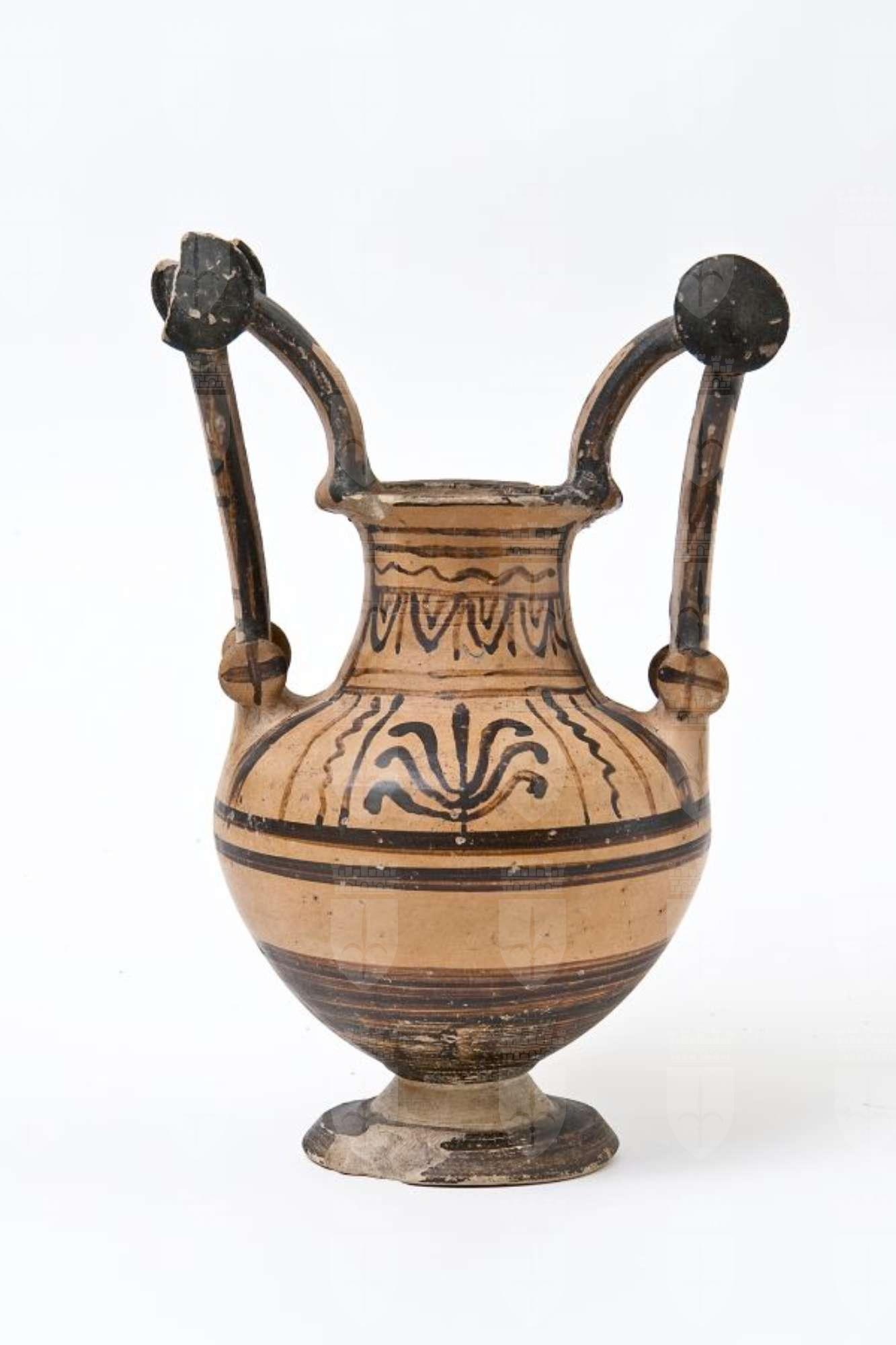Trozzella in ceramica messapica. Orlo estroflesso, alto collo troncoconico, a profilo concavo, corpo allungato a profilo ovoidale, con anse verticali sormontanti, impostate sull’orlo e sulla spalla, provviste di doppia coppia di dischi (“trozze”), di cui quelli superiori sono di dimensioni maggiori; alto piede troncoconico e spalla distinta. Decorazione monocroma in bruno-nerastro su fondo rosso, con piede, interno dell’orlo e anse dipinti in nero-brunastro; sul collo, pannello con linee orizzontali tremule, ovoli e lunghi pendenti; sulla spalla, un ramo d’edera con corimbi su un lato, mentre sull’altro un pannello con al centro un’antefissa a palmetta e linee tremule verticali ai lati. Nella parte inferiore del corpo, fasce parallele; sulle anse, tratti; dischi superiori dipinti, sui dischi inferiori linee incrociate.