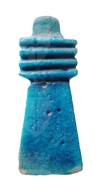 Amuleto che raffigura il geroglifico "djed", a forma di pilastro con quattro espansioni nella parte superiore, che indica stabilità, immutabilità, eternità, resurrezione, ma anche forza inestinguibile ed incorruttibilità. Già nella Prima Dinastia (3150 – 2925 a.C.) era un pilastro intorno al quale venivano legate spighe di grano; dal Nuovo Regno (1543 – 1078 a.C.) fu interpretato anche come spina dorsale di Osiride. Un djed, meglio se in oro, era posto sulla gola del defunto durante il suo funerale, con il compito di farlo divenire uno spirito santificato e perfetto, un seguace di Osiride. Nel capitolo 155 del Libro dei Morti l’amuleto fa sì che “è tua nuovamente la tua spina dorsale e le tue vertebre, così che puoi tornare a muoverti...”.