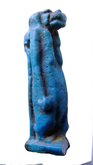 Amuleto in faience raffigurante la divinità apotropaica Toeris, patrona delle partorienti e dei neonati. La dea è raffigurata in piedi, con il muso di coccodrillo, una lunga parrucca, il corpo da ippopotamo gravido, con le braccia distese lungo il corpo. I piedi poggiano su una base parallelepipeda, mentre il dorso con la coda da coccodrillo si fonde con il pilastro dorsale. Sulla schiena è presente un anello di sospensione.