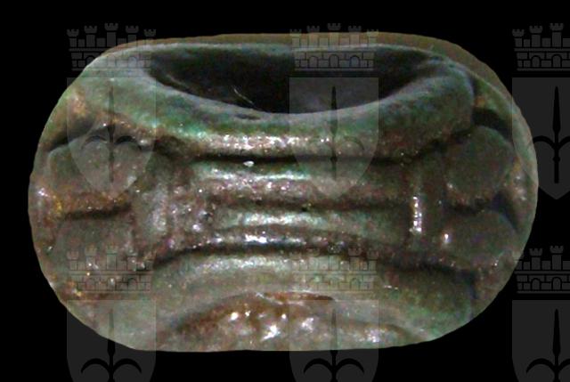 Sigillo in faience verde, con grafia corrotta del nome Amon-Ra, e il segno della canna fiorita raddoppiato. Dorso decorato da motivi vegetali stilizzati. Presa trasversale sul dorso.