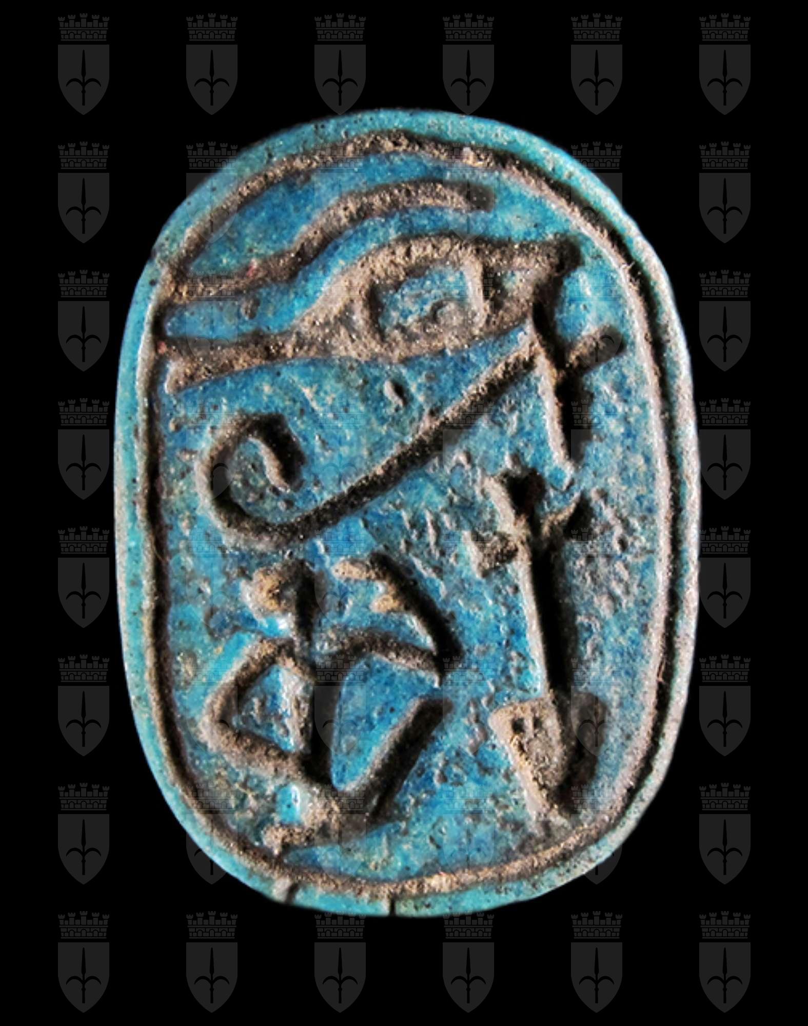 Scarabeo in faience turchese, con sul entre raffigurazione di un ugiat, sotto il quale vi è a destra un segno nefer e a sinistra il segno dell’uomo seduto con la mano alla bocca; si tratta forse dell’augurio “Salute e bene!”. Dorso con clipeo ed incisione a T per dividere il protorace e le elitre che presentano tacche a V. Foro passante longitudinale.