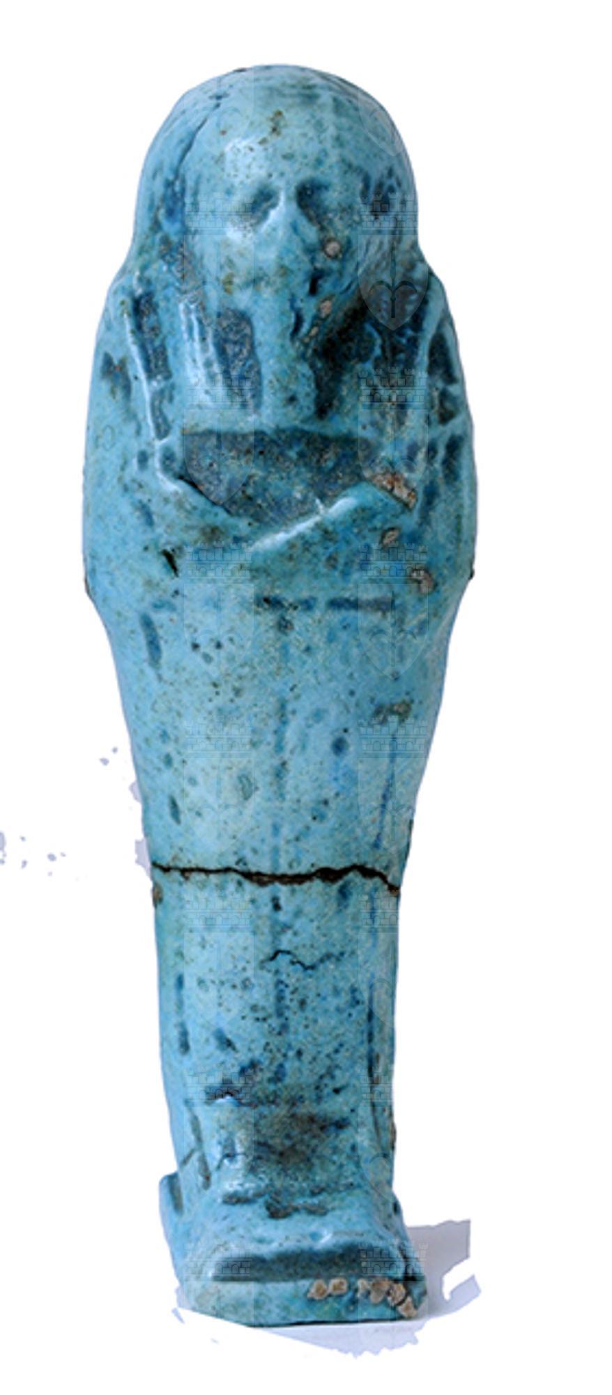 Statuina funeraria mummiforme che indossa barba divina e parrucca tripartita che continua con il pilastro dorsale. Le mani sono incrociate, la destra sopra la sinistra, e tengono rispettivamente una zappa e un attrezzo non identificabile per il deterioramento. Dalla spalla sinistra pende una sacca. I piedi poggiano su una base molto piccola. Sul davanti delle gambe si intuisce la presenza di un’iscrizione distribuita su due colonne affiancate, completamente illeggibile, mentre sul pilastro dorsale si trova un’altra colonna di iscrizione.