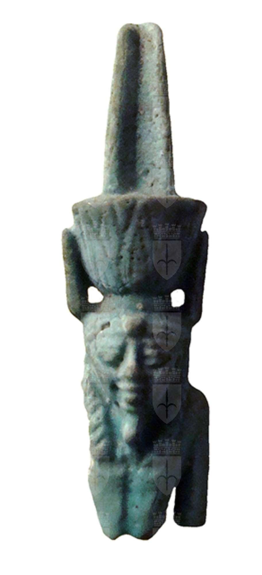 Amuleto in faience del dio Nefertum, divinità legata al profumo ed al fiore del loto azzurro. Il dio è riconoscibile per il suo tipico diadema: un fiore di loto da cui spuntano due alte piume diritte. Purtroppo la figurina è spezzata all'altezza della vita e anche il braccio destro è mancante, ma sul retro si vede il pilastro dorsale forato, per permettere la sospensione.