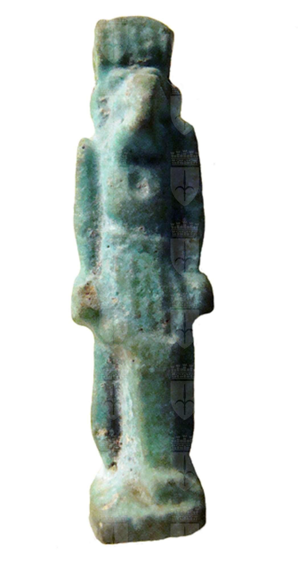 Amuleto in faience che raffigura il dio Thot, dio della sapienza e inventore dei geroglifici. Il dio è raffigurato in piedi, nell'atto di camminare (ha la gamba sinistra in avanti); la testa è quella dell'ibis, suo animale sacro, caratterizzata dal lungo becco a forma di falce lunare, con una parrucca che scende sul petto; le braccia sono stese lungo il corpo, con le mani chiuse a pugno; indossa un corto gonnellino pieghettato. I piedi poggiano su una base parallelepideda, che dietro si sviluppa nel pilastro dorsale. Sulla testa vi è un anello di sospensione.