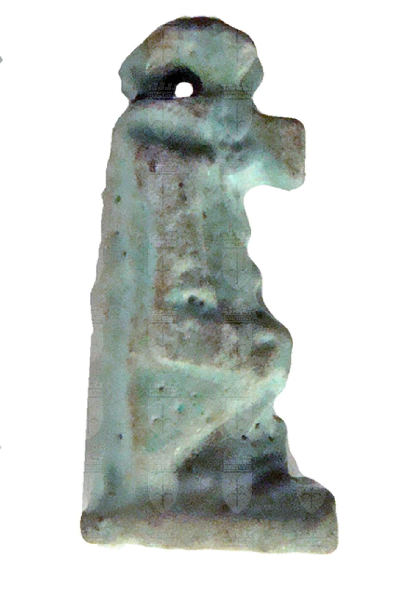 Amuleto in faience raffigurante la divinità apotropaica Toeris, patrona delle partorienti e dei neonati. La dea è raffigurata in piedi, con il muso di coccodrillo, una lunga parrucca, il corpo da ippopotamo gravido, con le braccia distese lungo il corpo. I piedi poggiano su una base parallelepipeda, mentre il dorso con la coda da coccodrillo si fonde con il pilastro dorsale. Sulla testa è presente un anello di sospensione.