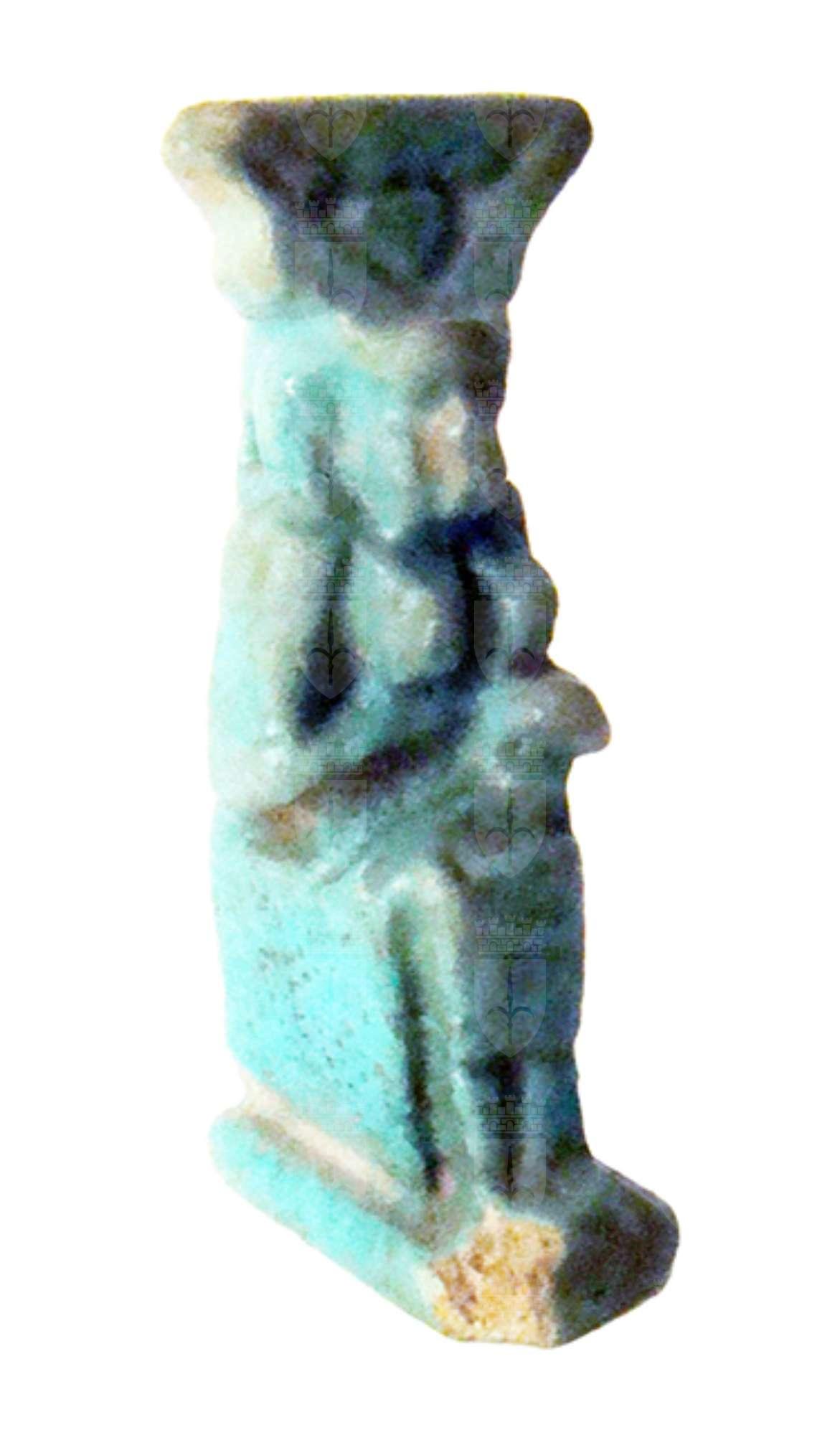 Amuleto in faience raffigurante Iside seduta su un trono, raffigurata nell’atto di allattare il figlioletto Horus, disteso sulle sue ginocchia. Sul capo Iside porta la corona con le due corna bovine tra cui vi è il disco solare (la stilizzazione della figura rende simile questa corona alla raffigurazione di un fiore di loto, forse volutamente); i piedi poggiano su una base, la quale prosegue dietro nel pilastro dorsale, forato per permettere la sospensione dell'amuleto.