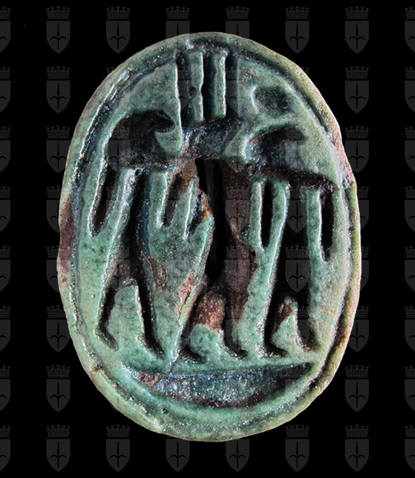 Scarabeo in faience turchese con sul ventre incisione che rappresenta una triade divina su un segno neb. Il dio centrale ha la corona di Ammone e quello di destra il disco solare sul capo.Il dorso presenta clipeo, protorace ed elitre separati da incisione a T. Foro passante longitudinale.