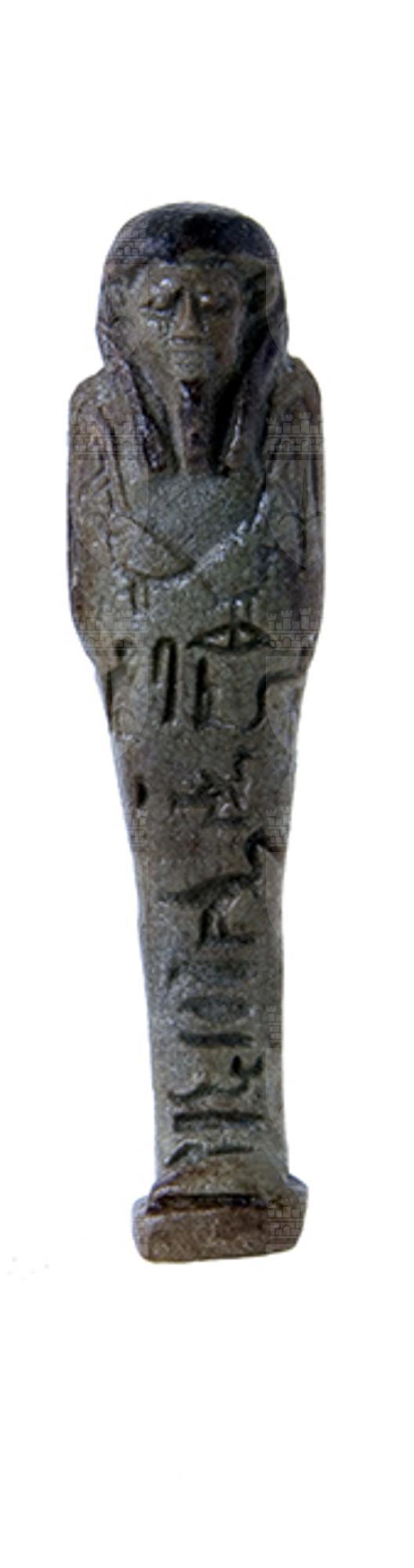 Statuina funeraria mummiforme che indossa una parrucca tripartita e la barba divina, dipinte in nero. Le mani incrociate, la destra sopra la sinistra, portano ognuna una zappa. Dalla spalla sinistra pende una sacca. Il pilastro dorsale e la base sono presenti. L’iscrizione è composta da una riga orizzontale e da una colonna, a formare una specie di T senza cornice sul davanti delle gambe.