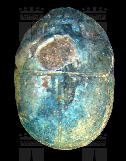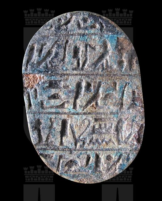 Scarabeo in steatite invetriata marrone sul cui ventre si vedono cinque incomprensibili righe di iscrizione. Incisione del clipeo sulla testa e della divisione a T tra protorace ed elitre. Foro passante longitudinale.È possibile che la pseudo iscrizione sia stata aggiunta ad uno scarabeo autentico per aumentarne il valore.