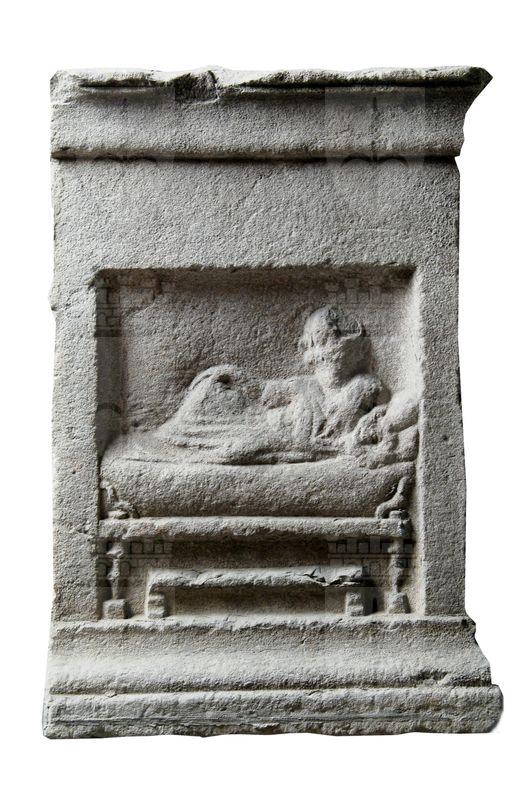 Stele rettangolare con zoccolo e coronamento modanato e sulla fronte entro un riquadro ribassato è realizzata a rilievo la figura umana adagiata su klyne: i volto è completamente abraso e indossa una veste a ricche pieghe