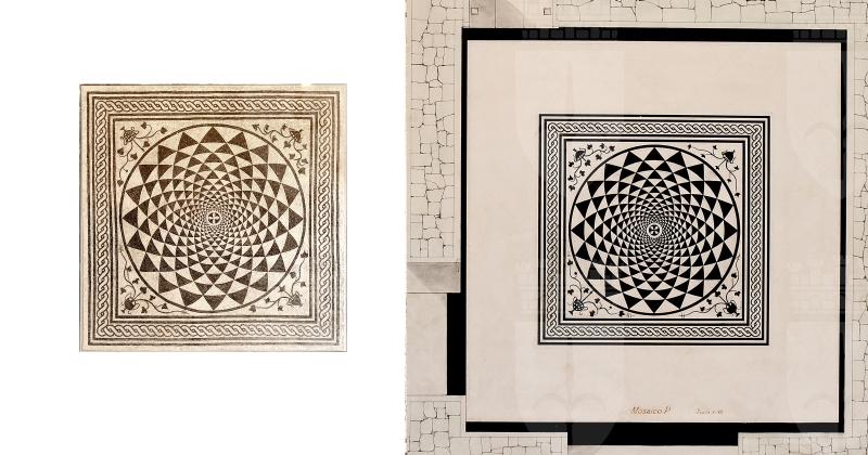Mosaico completo rimontato dagli (otto pannelli) del mosaico della seconda fase edilizia e appartenuto al cubicolo (stanza da letto) A’, del lato orientale del peristilio, che aveva questo pavimento a mosaico bianco nero con disegno a rosone, formato da una serie di triangoli neri incurvati e restringentisi verso il centro, costituito da un fiore a quattro petali bianco su fondo nero; negli angoli sono quattro cantari (vasi), di diversa forma, da cui spuntano rami e fogliette d’edera. La cornice ha una treccia continua tra due fasce bianche delimitate da linee nere. Il riquadro era inserito in una larga fascia bianca con bordo nero alle pareti.