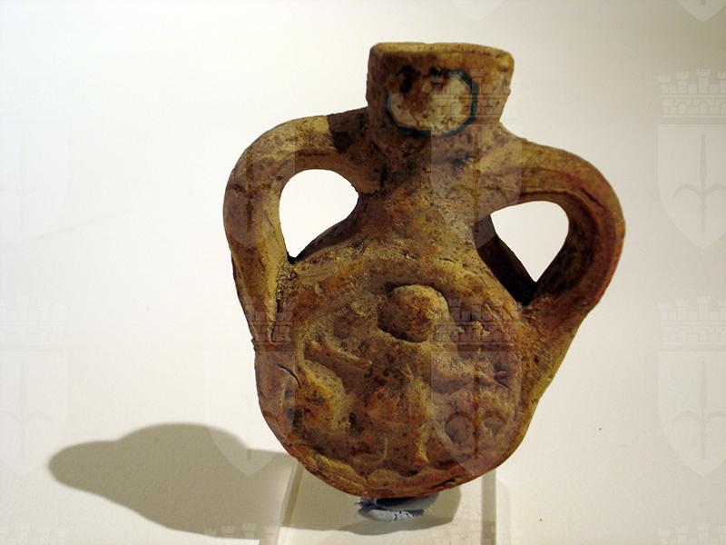 Ampolla realizzata in argilla di colore nocciola a forma di piccola borraccia biansata con ventre rotondo appiattito e collo cilindrico leggermente svasato. Sulle due facce discoidali raffigurazione resa da matrice abbastanza fresca. Lato A: bordo ad anello rilevato; nel campo il santo martire Menas in posizione di orante indossa la tunica corta stretta in vita, ma è sprovvisto della clamide.Nelle mani sono visibili le dita. La testa, resa come una massa indistinta, è affiancata a sx da una croce e a dx da un segno di difficile lettura. Lato B: al centro, racchiusa da un anello in rilievo, è una croce di Malta. Intorno, entro una sottile corona d'alloro reca un' iscrizione.