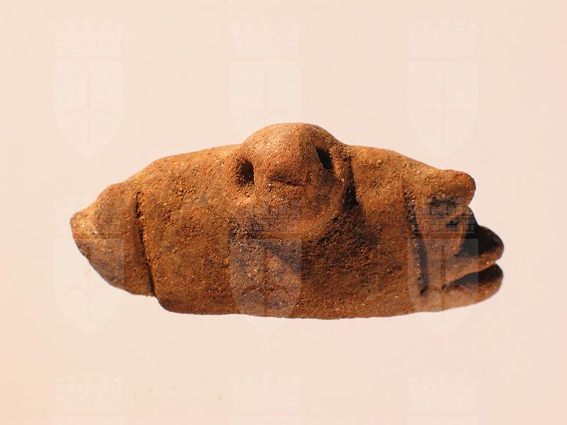 Piccolo copricapo di stile Usulután modellato con impasto di argilla. Il frammento apparteneva probabilmente ad una figurina antropomorfa. La fattura non è particolarmente accurata, tuttavia la forma del copricapo è perfettamente riconoscibile. Si tratta del tipo rettangolare con frange e testina di uccello in rilievo nella parte anteriore, frequente nelle figurine Usulután. Le frange laterali, che probabilmente rappresentano piume di uccello, sono rese con linee incise e scanalature parallele. Le fattezze della protome centrale sono appena abbozzate: muso appuntito e, ai lati, due fori per gli occhi.