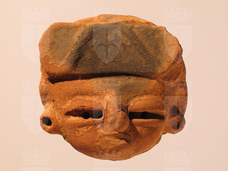 Sonaglio fittile di stile Usulután modellato con l’effige di un personaggio di classe sociale elevata. L’interno della testa è cavo e contiene dei pezzetti di argilla; questi, producendo suono, conferiscono all’oggetto un particolare valore rituale. L’uomo porta dei cerchi forati come ornamenti auricolari e un copricapo ornato da due placche rettangolari che coprono interamente la fronte e la nuca. La protome zoomorfa che di solito completa questo tipo di copricapo è spezzata. Modellata con pasta di argilla color arancio, conserva tracce dell’ingobbiatura crema seppur alterata da una bruciatura.