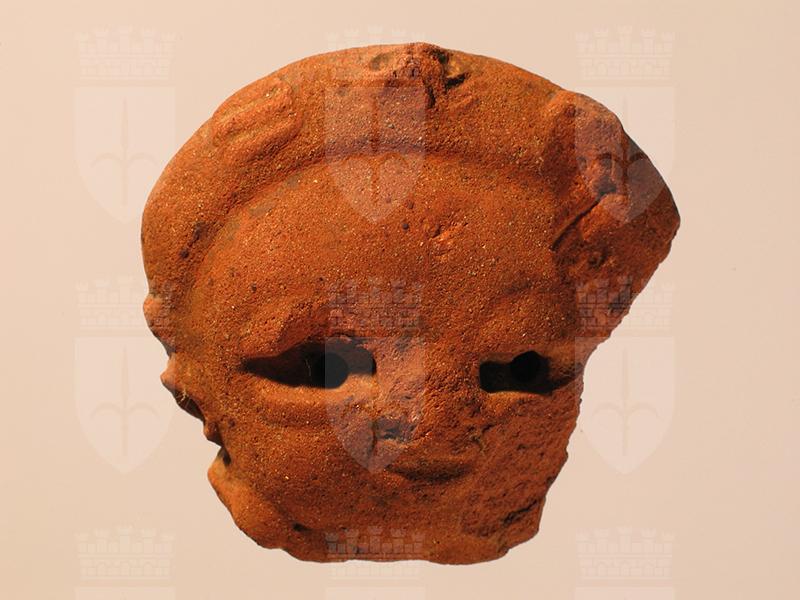 Testina fittile di stile Usulután modellata in modo da rappresentare un volto umano privo di espressione. Il viso è rotondo e dominato da una fronte larga e piatta. Naso e labbra sono scheggiati. Gli occhi sono due profonde incisioni orizzontali con un foro al centro per individuare l’iride. Il personaggio indossa orecchini e un turbante ornato frontalmente da un’applique zoomorfa che raffigura, probabilmente, un uccello con le ali aperte. Intorno al collo sono appena abbozzati due elementi di collana. Gli ornamenti segnalavano la posizione sociale del personaggio.