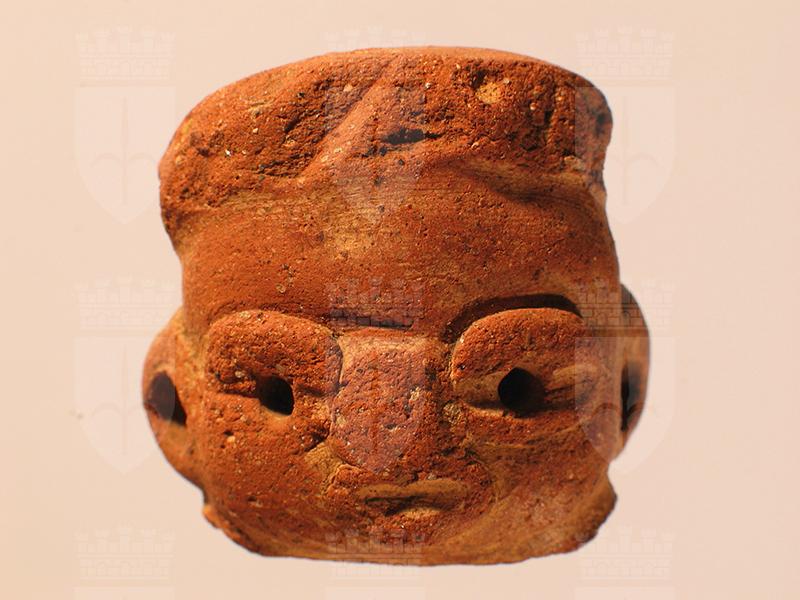 Schematica rappresentazione di stile Usulután di una testa umana, modellata in terracotta rossa con tracce di ingobbiatura bianca. La forma della testa è cilindrica mentre i tratti del viso sono applicati con la tecnica del pastillage e appaiono molto sporgenti. Gli occhi sono perforati nel mezzo come anche le orecchie. Anche il copricapo è cilindrico.