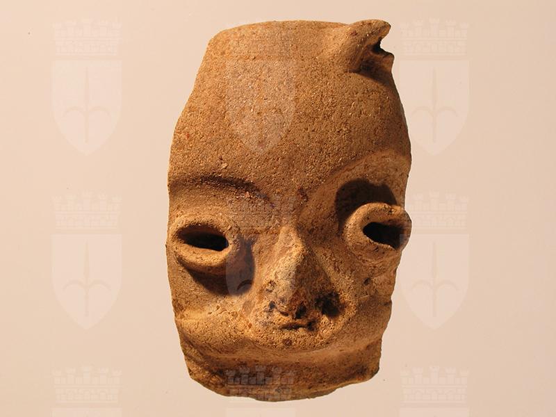 Frammento di vaso configurato di stile Usulután. Si tratta di una porzione del collo di un vaso che raffigura una testa antropomorfa. La parte interna del frammento è concava. La superficie esterna è di colore grigio, effetto ottenuto mediante cottura ossidoriducente che impedisce l’ossidazione dei minerali argillosi. Il volto è reso con pochi tratti essenziali: gli occhi di forma ovale, hanno il contorno a rilievo, il naso e la bocca, anch’essi sporgenti, sono in parte scheggiati. La fronte è liscia e si incurva verso l’alto seguendo la convessità della parete esterna. In alto termina con un orlo arrotondato.