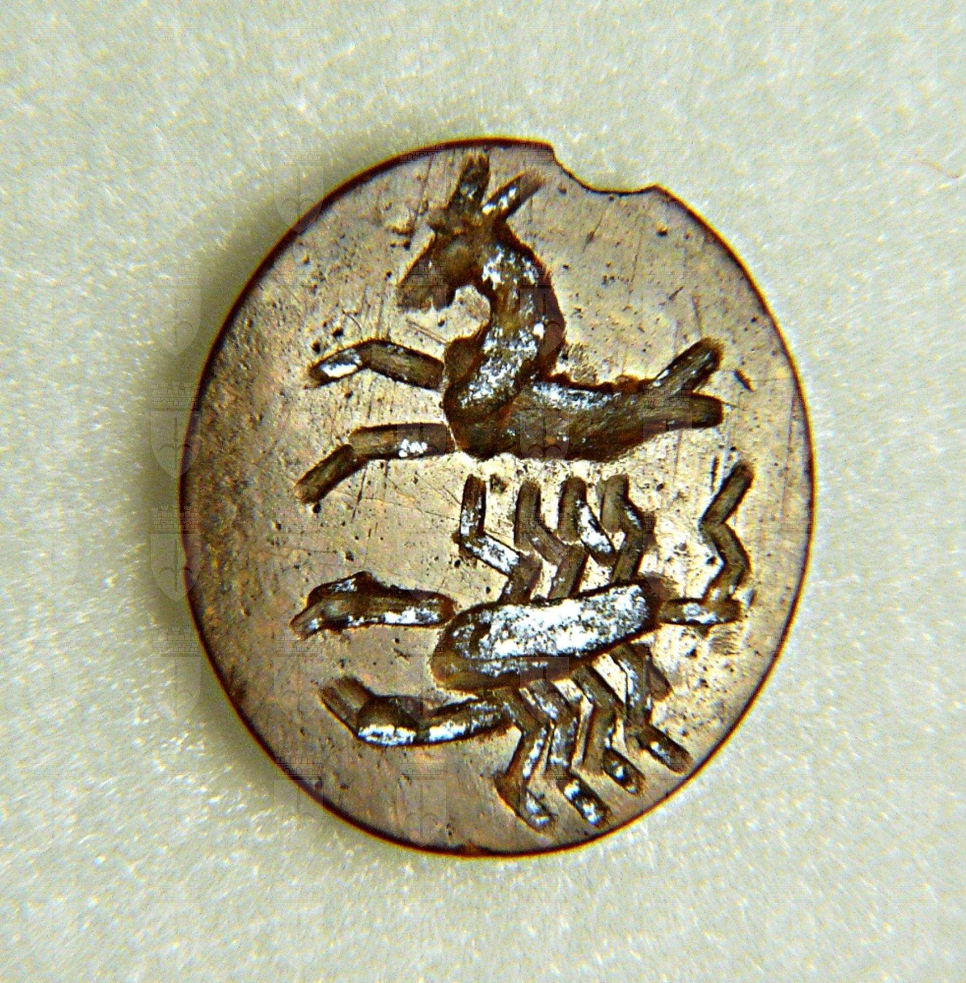 Gemma di forma ovale, piana, inferiormente troncoconica. Sul registro superiore, capricorno volto a sinistra; sul registro inferiore, scorpione visto dall'alto, volto a sinistra, con otto zampe.